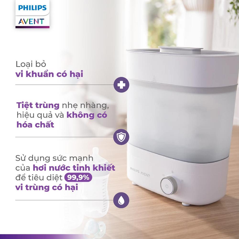 – Tiệt trùng hiệu quả 99,9% vi khuẩn có hại bằng hơi nước tinh khiết, không cần dùng hóa chất, an toàn cho sức khỏe bé.