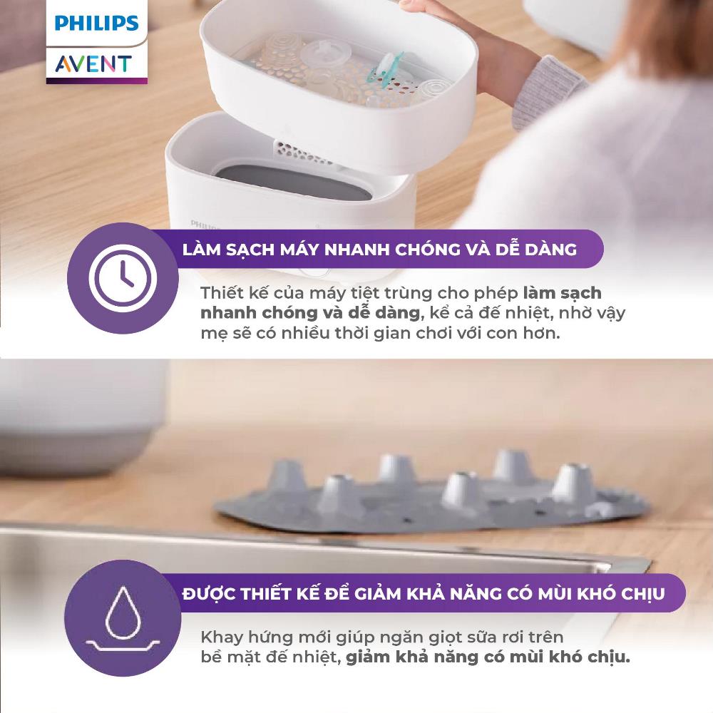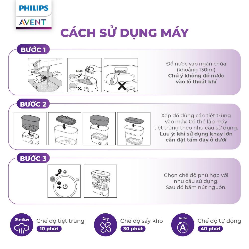 – Chu trình hoàn chỉnh chỉ 40 phút: kết hợp tiệt trùng và sấy khô nhanh chóng, giúp tiết kiệm thời gian cho mẹ.